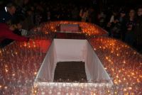 Menschenmassen, Gedränge, ein Gebäude mit der erleuchteten Zahl 89, Kerzen, Ruhe, Frieden, Lächeln, Gelassenheit ...